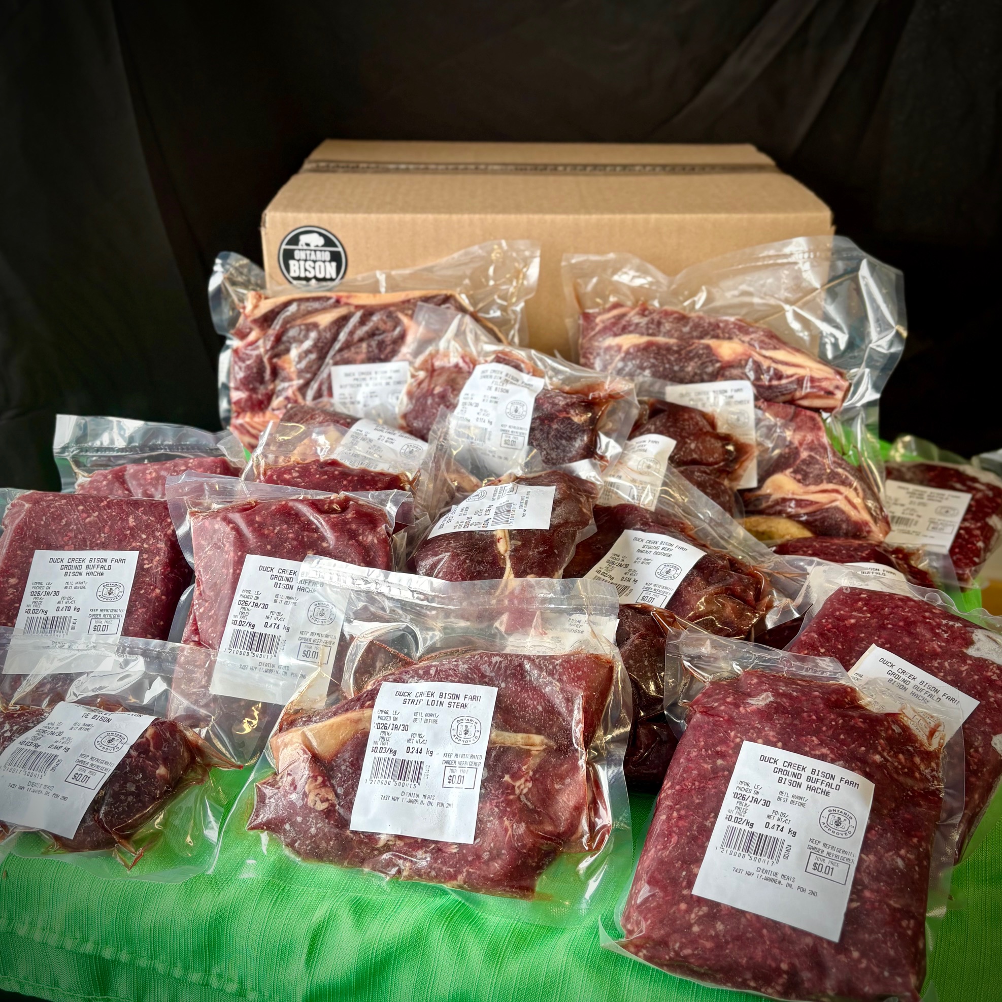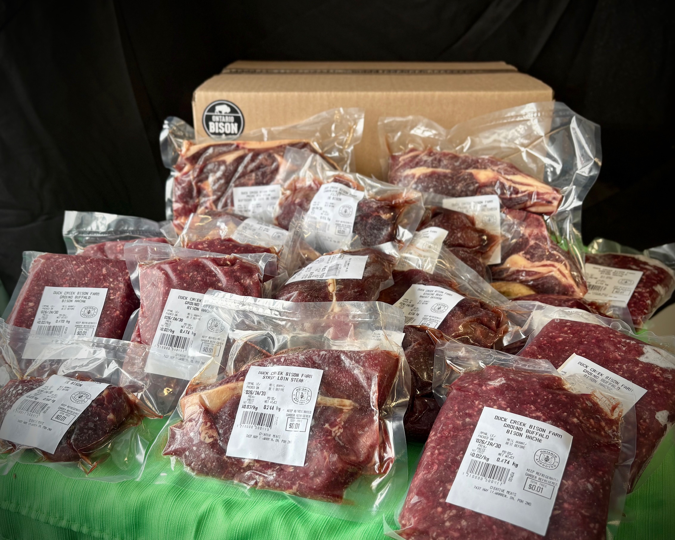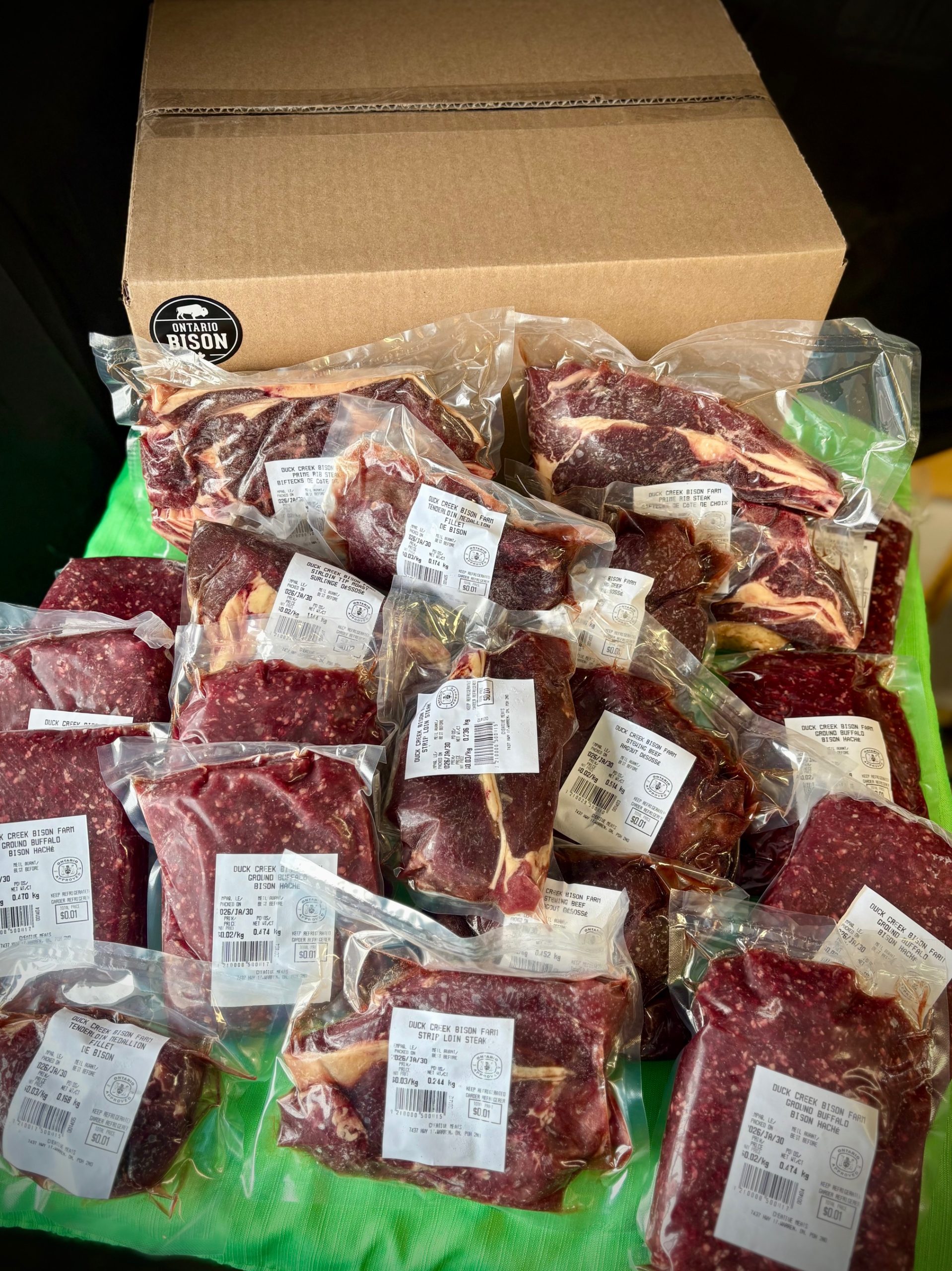 Our Bison are completely grass fed on 500 acres of entirely organically managed land and have NEVER received any form of antibiotics or hormones. Grass-fed Bison is a naturally leaner meat with a pure unmatched flavour profile. Each cut of our stock is traditionally butchered to provide the best quality bison to our customers.