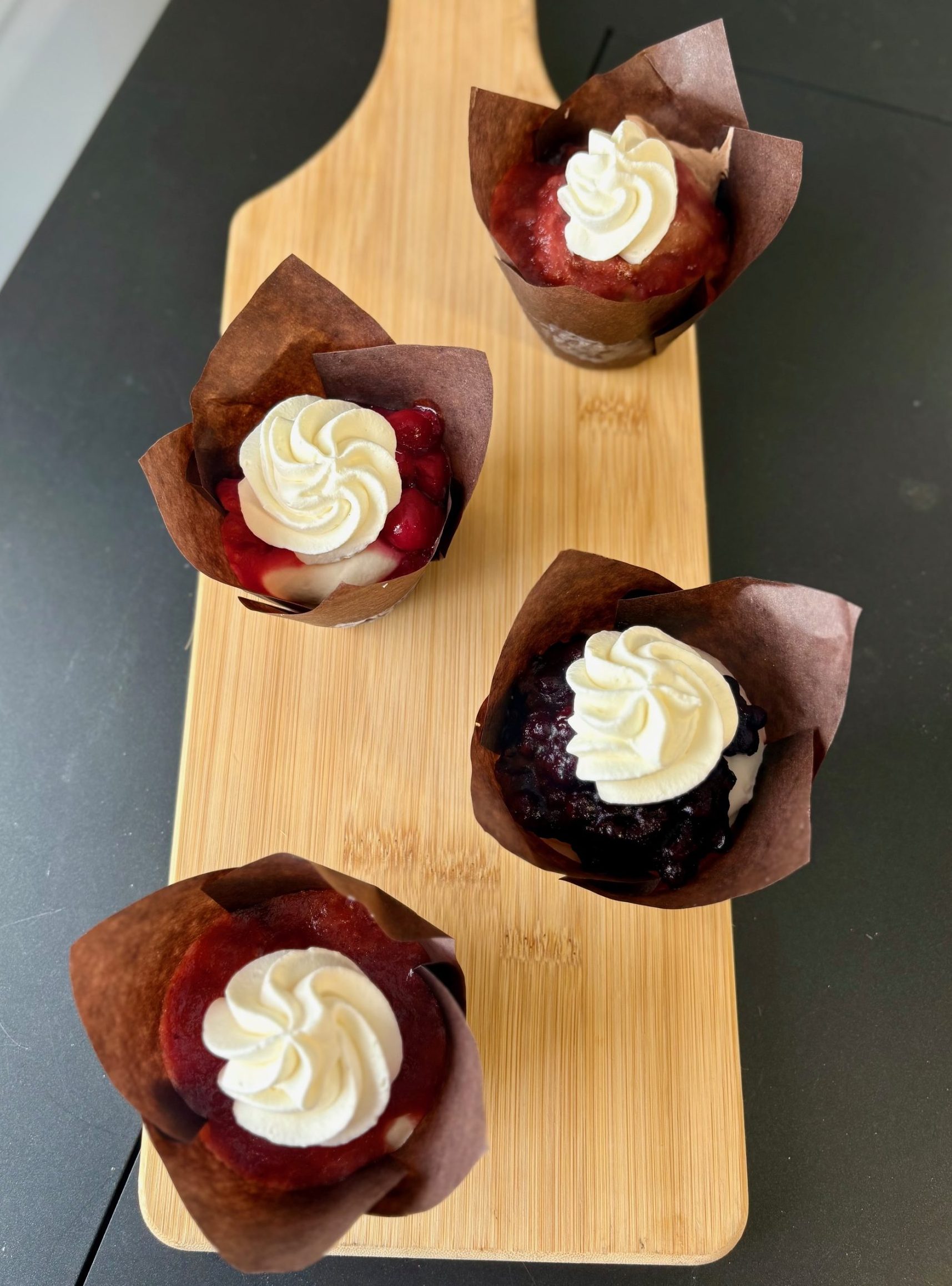 A delicious light and fluffy cheesecake cup topped with Click Forks’ Honey Sweetened Jam, whipped cream. A variety of flavours and variations available!