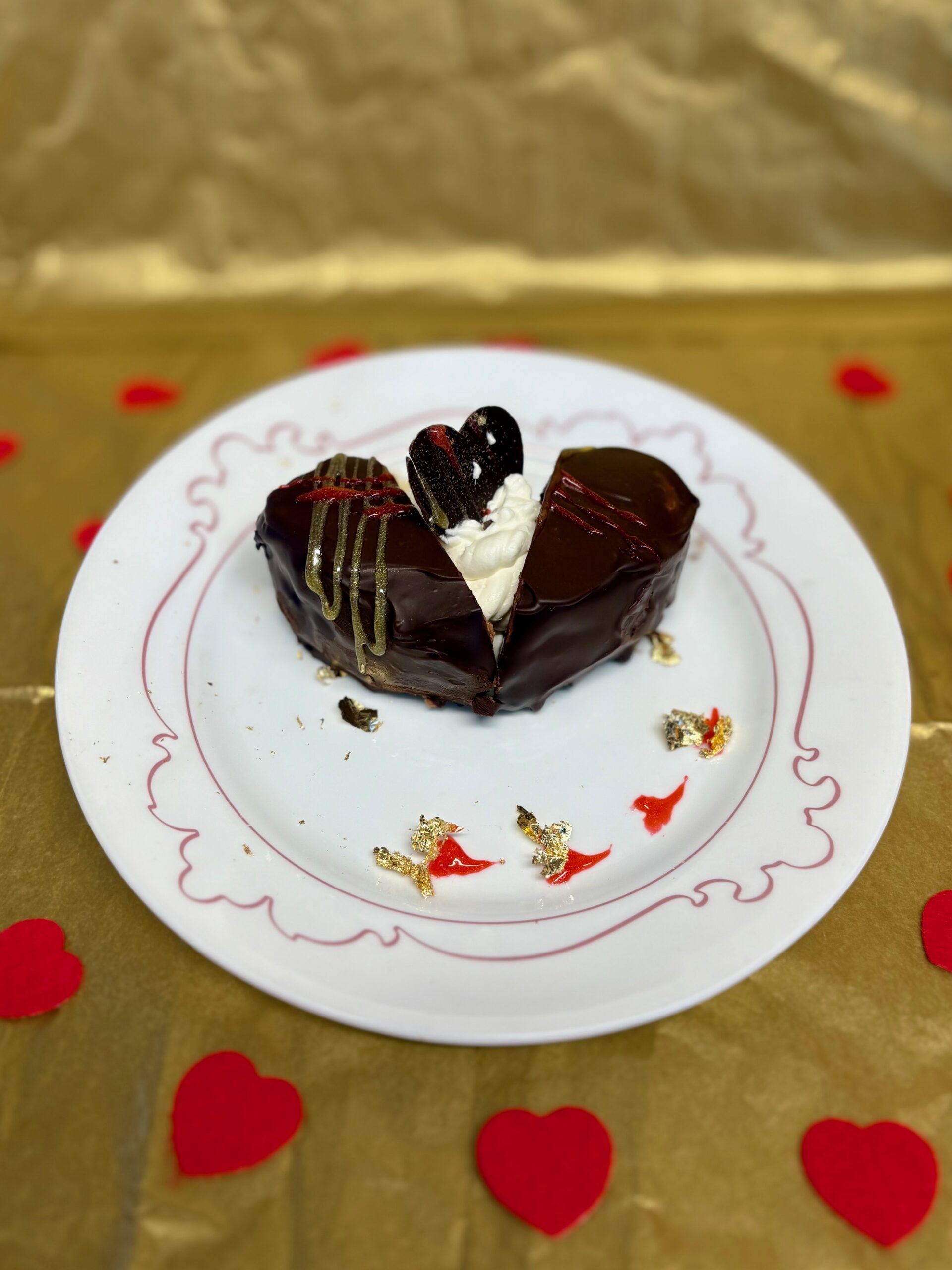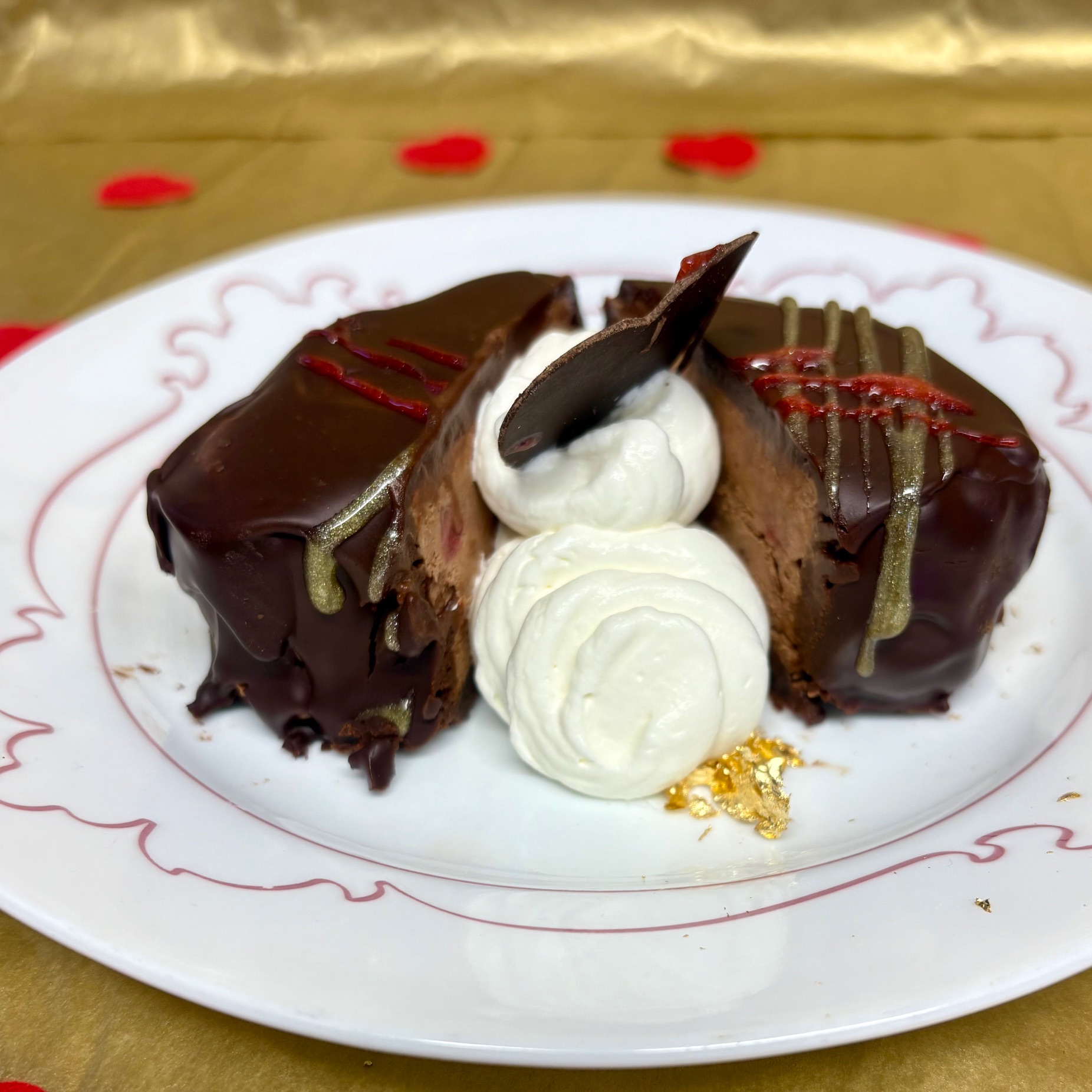 This heart shaped chocolate cheesecake features a rich brownie chocolate base, with real strawberry hidden inside. It’s finished with a smooth layer of chocolate ganache, adding the perfect touch of indulgence. It’s fudgey, fruity, and beautifully balanced. A chocolate lovers dream, and, it’s Gluten-Friendly to boot!