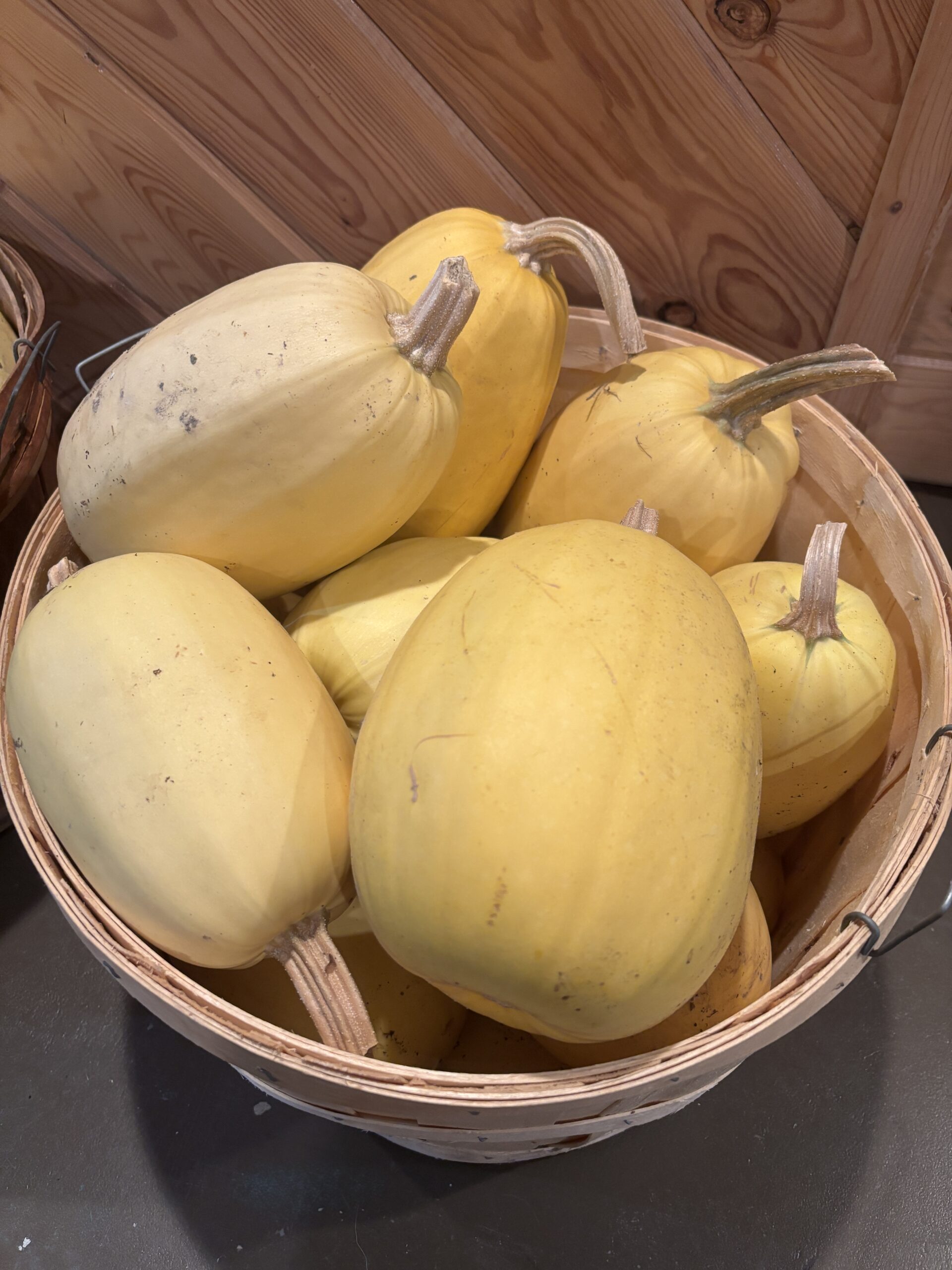 Large spaghetti squash grown at Ferme la Binette in Lavigne, ON.