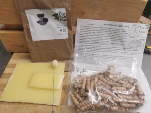 Comes with 100 dowels inoculated with black oyster culture, wax, and wax daub. Includes a set of instructions with a link to an instructional video.